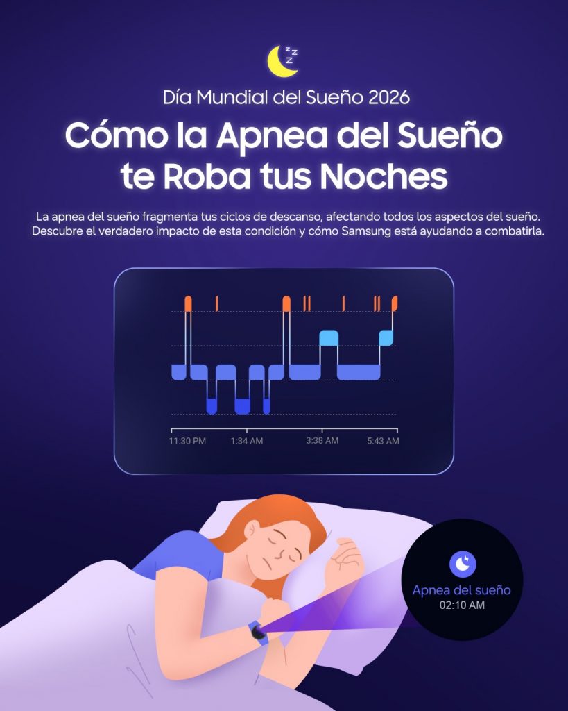 Para conmemorar el Día Mundial del Sueño 2026, un estudio global de usuarios de Samsung Health[2] está arrojando nueva luz sobre el verdadero alcance de la enfermedad y el impacto perjudicial que tiene en el sueño. En sintonía con el tema del Día Mundial del Sueño de este año, “Sleep Well, Live Better” (“Duerme bien, vive mejor”), Samsung está convirtiendo los signos invisibles de la apnea del sueño en información práctica a través de su serie Galaxy Watch, ayudando a los afectados a mejorar sus hábitos de sueño y su salud en general.